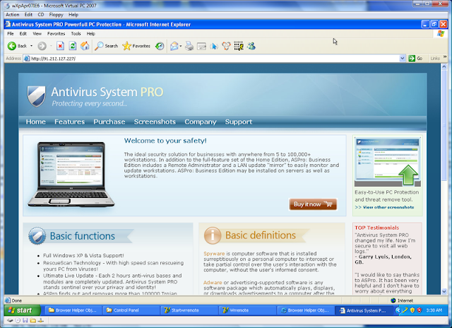 Basically, the rogue antispy was directing the victim to a genuine Microsoft address, but was modifying the html on the fly as it came back from the real Microsoft page. It made it read that Microsoft was recommending that the victim should buy the rogue. That’s a pretty good trick that will catch a lot of folks, and it reminded us of another one that we frequently see.