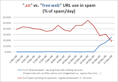 The motivation behind this seems more related to cracking down on porn sites, but since .cn domains have been the call-to-action in 35-50% of all spam being sent for well over a year, we were wondering what effect this policy change may have on the prevalence of this TLD in spam. The graph below illustrates the percentage of spam messages sent each day that contain a .cn domain (vast majority are Canadian Pharmacy type spam) as well as the percentage of pharmacy spam messages sent that contain a link to a free webhosting service (blue). I decided to measure the .cn abuse, against free webhosting abuse, as the same Canadian Pharmacy spam that contained links to .cn domains for the past few months, now contain links to a number of free webhosting services instead. The CNNIC changes started to be applied on December 14th.