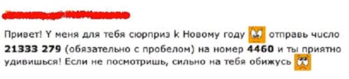 “Hi! I’ve got a New year surprise for you [emoticon] send 2133 279 (must be with a space) to 4460 and you’ll be pleasantly surprised! If you don’t take a look, I’ll be very grouchy with you [emoticon]”