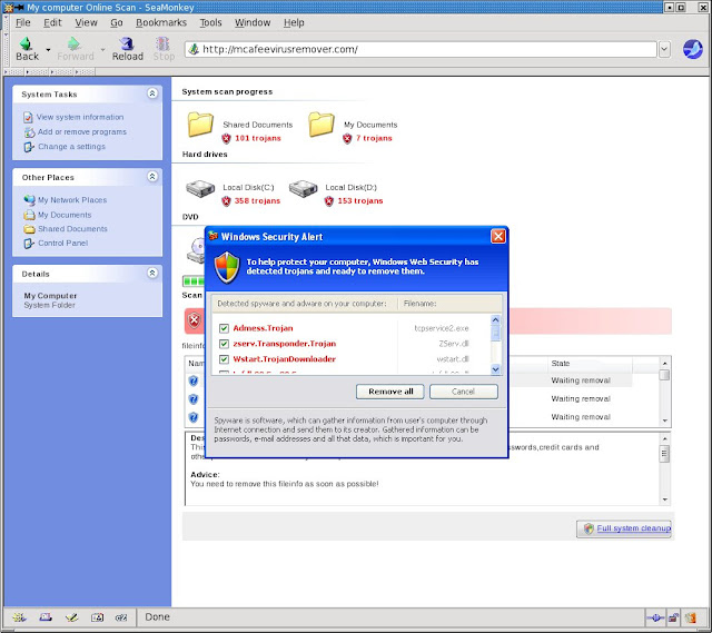 The infection begins by redirecting the victim to the domain hosting the Trojan script code. This website is designed to look like Windows Explorer in Windows XP. It “reports” multiple infections on the victim’s computer:
