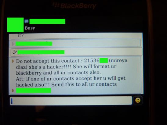 I received an interesting IM from a friend via BlackBerry Messenger [BBM] this weekend. She was worried that it could do damage to her shiny new BlackBerry and, as she knew I work for [a security company], she forwarded it to me for my opinion.
