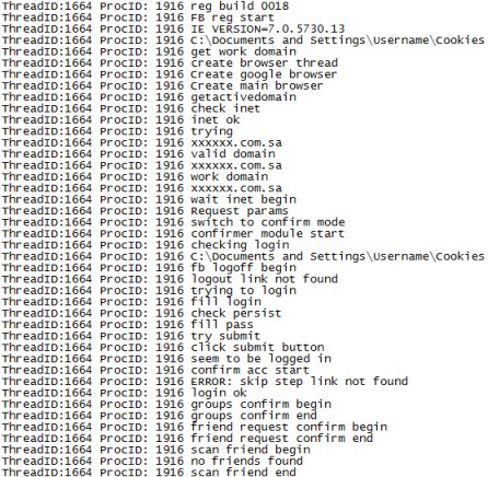 The worm saves the response received in another log file as below. It then tries to log on to the Facebook account using the logs. On successfull login it tries sending friend requests or scan friend lists. In case the credentials are not accepted, it terminates itself.