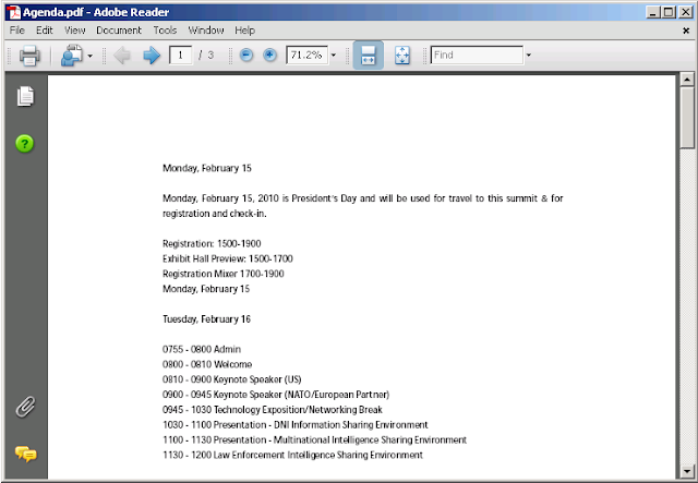 Now, what is the document talking about? President’s day? DNI Information Sharing Environment? We don’t know, but a quick web search tells us that apparently there is going to be an Intelligence fair & expo in Germany next month.