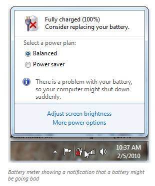 Windows 7 makes use of a feature of modern laptop batteries which have circuitry and firmware that can report to Windows the overall health of the battery. This is reported in absolute terms as Watt-hours (W-hr) power capacity. Windows 7 then does a simple calculation to determine a percentage of degradation from the original design capacity. In Windows 7 we set a threshold of 60% degradation (that is the battery is performing at 40% of its designed capacity) and in reading this Windows 7 reports the status to you. At this point, for example, a battery that originally delivered 5 hours of charge now delivers, on average, approximately 2 hours of charge. The Windows 7 the notification is a battery meter icon and notification with a message “Consider replacing your battery”.