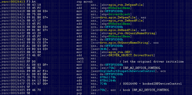 Most of the time the driver chosen by Tidserv to be infected is “atapi.sys,” but that may vary depending on the hardware configuration. One of the very things the infected driver does when it is loaded by the operating system is to retrieve critical API addresses so that it can allocate memory to load the actual malicious code: