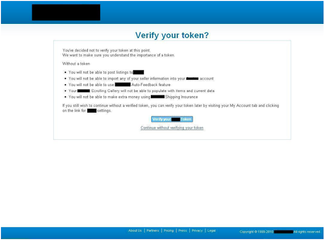 Upon entering credentials onto the auction tools phishing site, the user will be asked for verification of the main online auction website, as in the above example. The phishing page states that the verification process is required to obtain a token for access of tools. The page states that if the user opts out of the token verification process, tools that enable the import of seller information, financial gains from shipping insurance, and the update of image-scrolling galleries of products, etc. will not be available to the user. A link is provided in the phishing page that states, “Verify your token.” Upon clicking the link, the page is redirected to the phishing page of the main auction website.