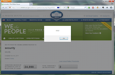 The XSS Demo is here: https://wwws.whitehouse.gov/petitions/!/petition/security/WxgwM7DS