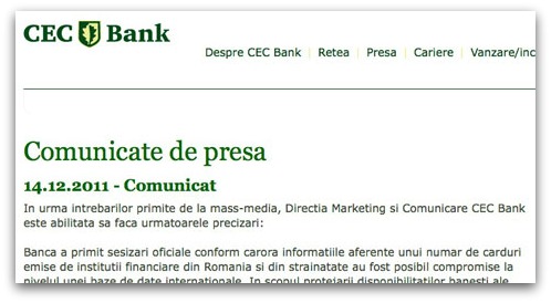 The bank has been informed that a number of cards issued by banks in Romania and abroad have been potentially compromised through an international database. CEC Bank has decided to block the cards and reissue a new card and PIN, at no cost, for a number of cards in its portfolio