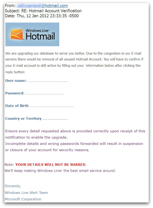 The email then requests that you reply with your Hotmail username, password, date of birth and country. Of course, doing so puts vital information right into the hands of the cybercriminals.
